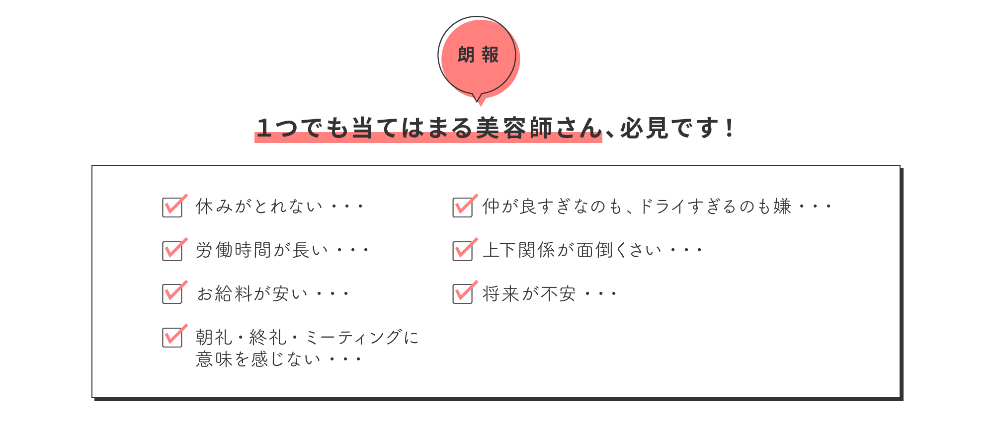 | 職種 | スタイリスト(選べる勤務スタイル) ・正社員 ・業務委託 ・面貸し※指名のみ |